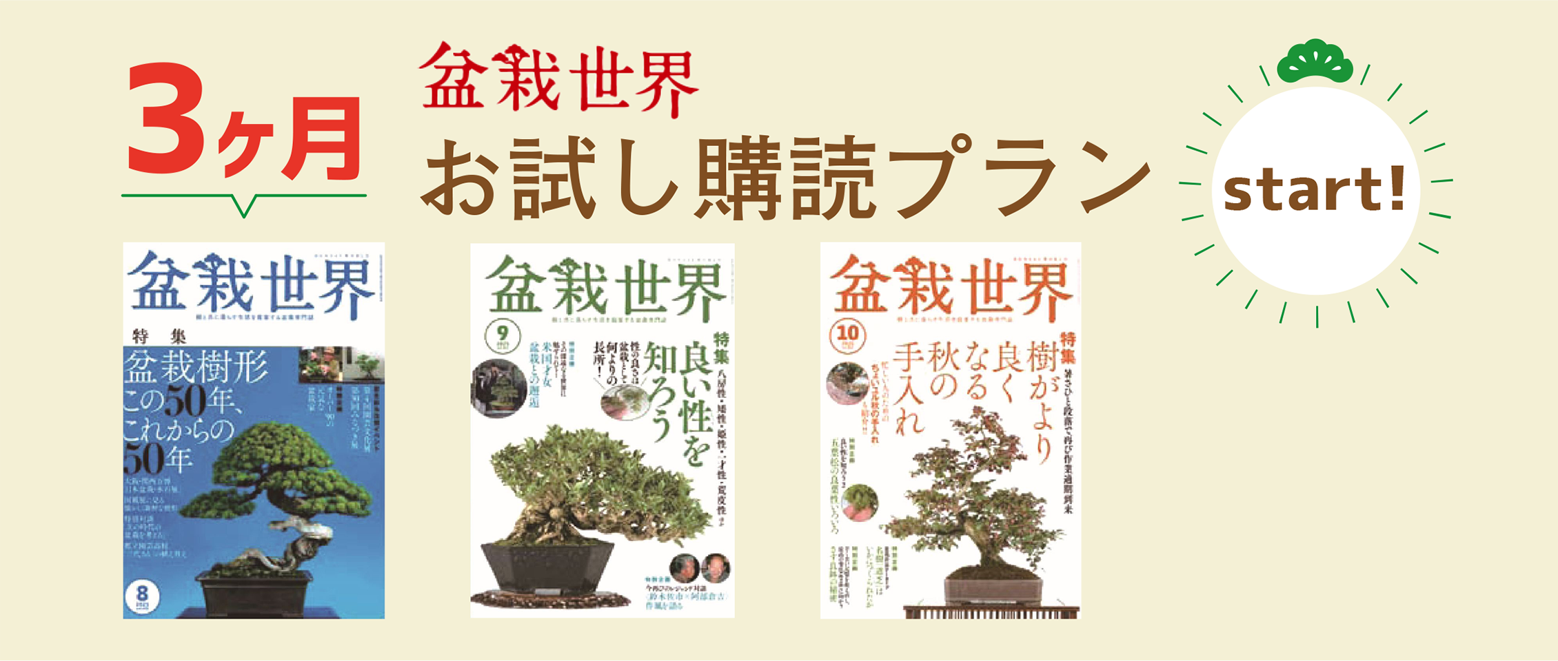 「盆栽世界ウェブショップ 新規登録&購入プレゼントWキャンペーン」(~2021年2月28日まで)を開催しております。耐暑性・耐乾性向上資材「サーモテック」お試しミニサンプル先着300名様、菌根菌資材「盆栽共生菌(樹種別)」(非売品)毎月10名様 にプレゼント! キャンペーン詳細については、月刊「盆栽世界」最新刊誌面をご確認ください。多くの方からのご応募をお待ちしております。
